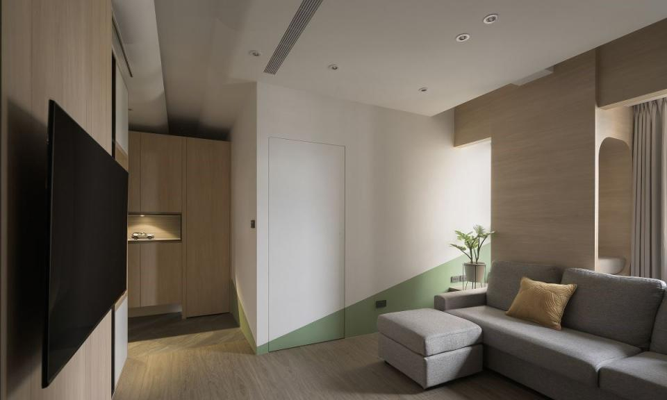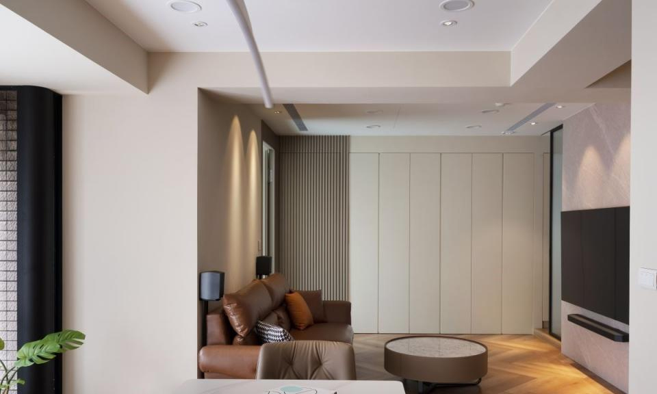 设计师整合格局,将原始的三房两厅格局被重新规划,将一间客房与客厅的位置对调,顺利化解了原屋的穿堂煞问题;客厅区域的尺度则经过精心的调整,确保电视和沙发之间的距离舒适、也为公领域的提供新的使用方案。
