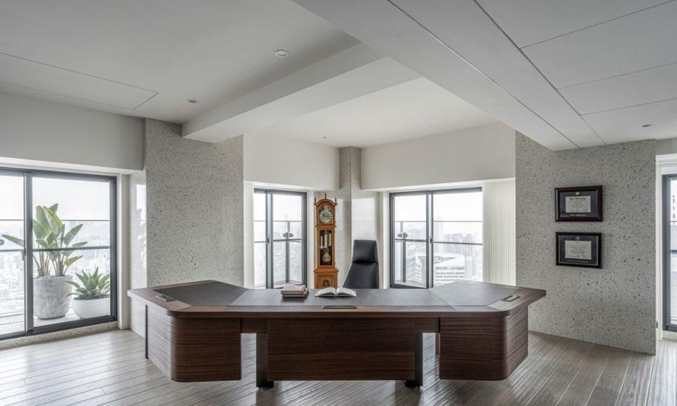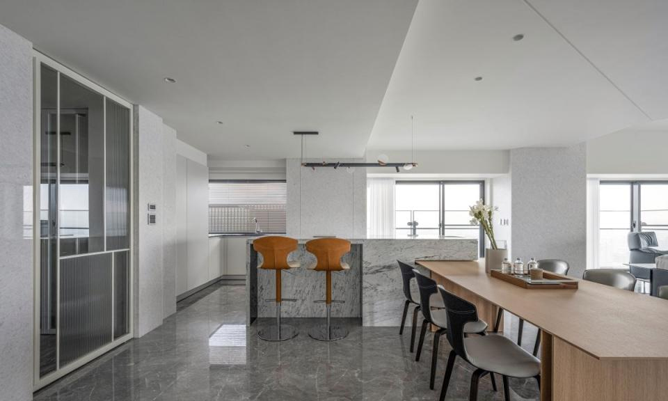 毛胚屋从零开始规划,汇整夫妻旅居国外的美好经历,宽敞有view的开放式大客厅、欧美感开放式厨房、风味浓厚的欧式啤酒吧,以及独立家庭剧院和舒适的星题套房设计,室内装修设计费时三年时间将屋主所爱都规划在300坪新居,实践退休夫妻理想的生活居所。 考量到住宅安全性,全室以无阶差地坪设计,公领域挑选浅灰纹理的海洋之星大理石砖,利用地坪材质的分割达到无障碍的动线;原本低矮的屋高也透过天花板造型几何分割虚化大梁,高低错落的天花设计也弱化了屋高问题。