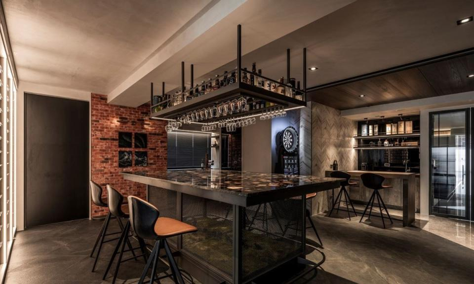 开放客厅以更随兴的方式布局,沙发、钢琴、中岛与窗景形成自由的动线,用空间诠释国外生活的自在步调。夫妻的办公区改为木地板,以玻璃拉门区隔创造独立但又不封闭的私人空间。 除了开放中岛之外,女屋主特别规划一区精酿啤酒吧台给男主人,透光的玛瑙桌吧台桌搭配红砖墙,还铺上人工草皮结合动物公仔,以及整柜的啤酒冰箱;长桌之外还配置小型调酒吧台和飞镖机,打造专属最舒适的休闲娱乐场所。另外,也在客厅之外规划一间独立的视听空间,家人朋友可以享受到最极致的影音与游戏体验。