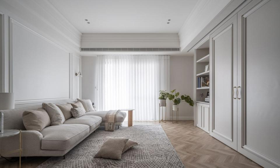 由复古花砖所铺设的玄关进入后,望眼即是一片温柔的奶茶色,以及富有文艺复古气息的鱼骨拼木地板,引领时髦优雅的美式风格氛围。玄关处也特别加入拉门设计,营造居家空间的隐私性。另外,因原有玄关格局有较多零角,和破碎的畸零空间,透过小型的储藏室规划,不仅增加收纳量,更将直立式的电子衣橱完美隐藏。