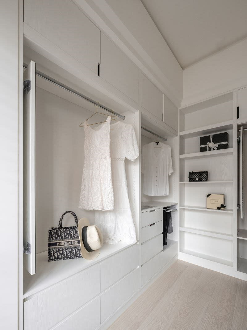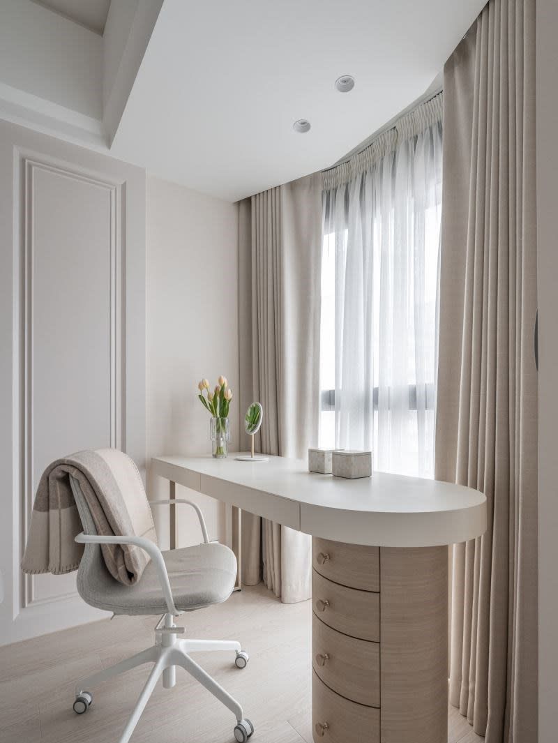 设计师将原本的四房墙面微调,不仅使主卧室的面积加大,原有的两间次卧则分别规划为工作区和更衣间。因男屋主从事金融工作,需要较多的隐密性,也特别因应工作需求加强网速,与加装电子锁,搭配量身订制的电脑桌与男主人的收藏展示,让男主人能有独立办公、不受打扰的秘密基地!