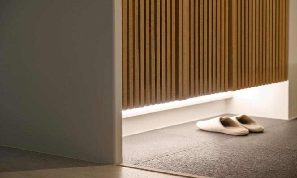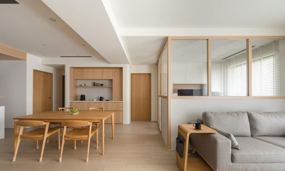 入门玄关处,铺叙深灰色的烧面地砖,巧妙明确了落尘区的地坪分野,侧边鞋柜门片上的格栅造型更与之相互呼应,打造沉淀心绪的归家仪式感;接着,公共空间以开放式设计为主轴,活动式家具无形界定了场域间的用途,客厅后方更使用了弹性拉门及穿透的玻璃材质围塑屋主的办公书房,不仅兼顾共享采光及延伸视野的优势,更创造出互动感满满的居家空间