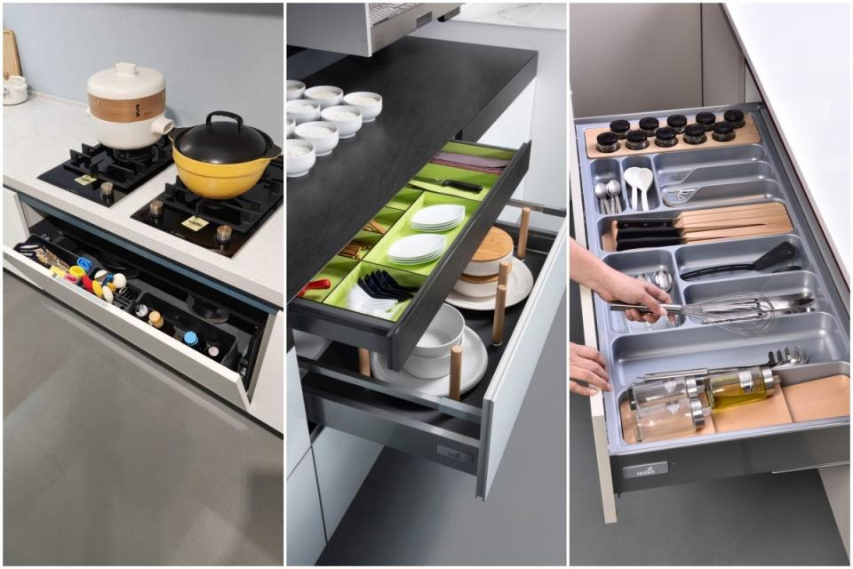 • 客制化隔层: 将各式厨具分门别类,井然有序;厨余桶也有专属的家。