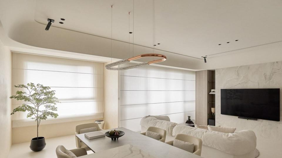 特别重视整体氛围营造的及境空间设计许维庭总监,拥有着美术创作与绘画的背景,在装修手法上视空间为一个承装生活的舞台,从整体空间架构、灯光布局、色调调和到家具陈设都会影响画面呈现的效果,因此在此两案中,不仅是硬体装潢与光线设计,连同家具软装也一并做规划。 35坪熟女住宅的沙发简约优雅,茶几则挑选带有雕塑感的设计,最特别的是订制全平面的电动罗马帘,宛如剧场布幕透着大面自然光,设计简约但却带着内敛的气派感,以匠心独运的设计手法,达到视觉低调但看得出是经过精心设计的空间。