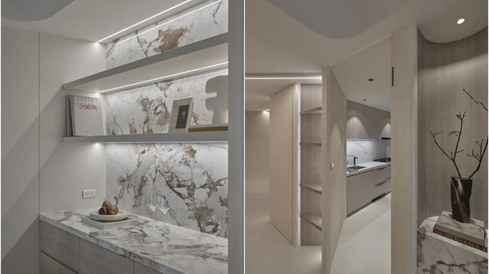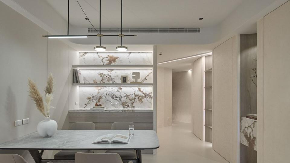 室内设计有一点像是化妆,底妆画得够好,没有艳丽的唇彩眼妆却更显肤质亮丽!这两间委托人皆为女屋主,虽然是两个世代的女性,但同样追求把自己生活过得舒适自在。及境空间设计许维庭总监面对两间坪数不同,但对于新家有着同样期许的两位新独立女性,设计上着重在打好住宅基底。与现代流行的侘寂风不同,整体空间虽然是选择浅米调性,但依照屋主个性与需求,在涂料的选择与纹理呈现出不一样的质感。像是15坪年轻女性居住的空间,选择轻透的设计工法呈现清透无瑕的涂料质地;进口大板砖拟真的大理石纹与展示端景,呈现优雅却不过于铺张的舒心感。